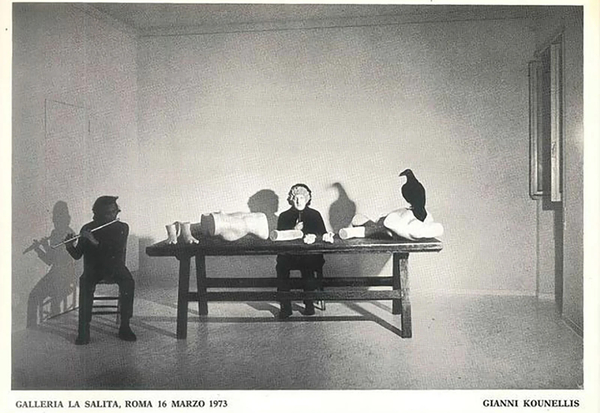 Выступление Кунеллиса в Galleria La Salita, 1973 год / Презентация книги Янниса Кунеллиса «Изобретать на месте», 1972 г., на выставке Documenta V, Кассель, 1972 г.