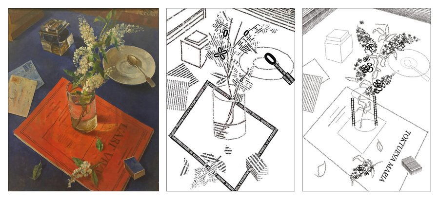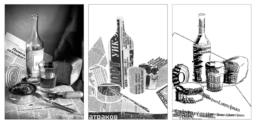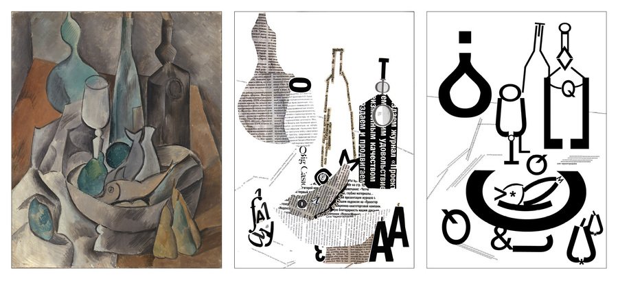 На второй клаузуре студенты получают карточки с натюрмортами, которые также интерпретируют, используя инструменты типографического коллажа.