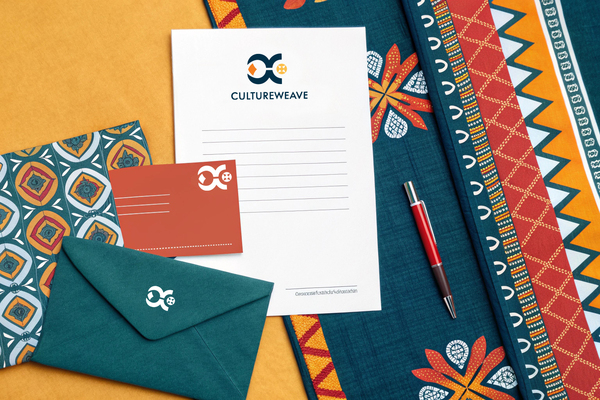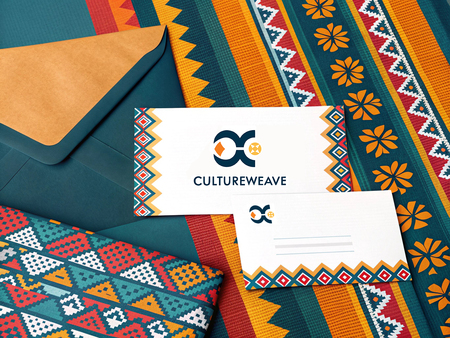 Recraft.ai. Prompt: Create an identity (envelopes, papers, business cards) for the brand of fashionable cultureweave skirts, inspired by the folk flavor of different countries, against the background of neutral fabrics, using bright natural colors such as mustard, sea green and brick