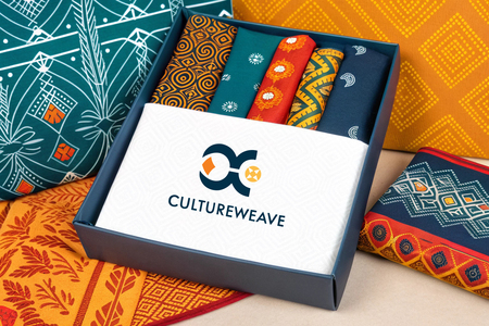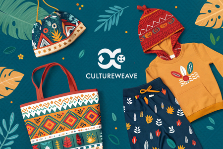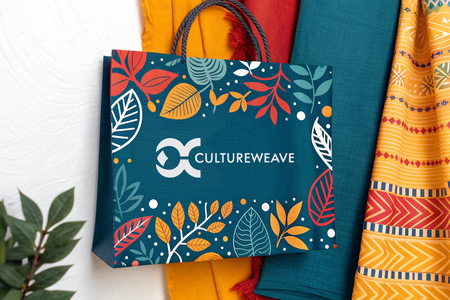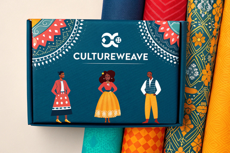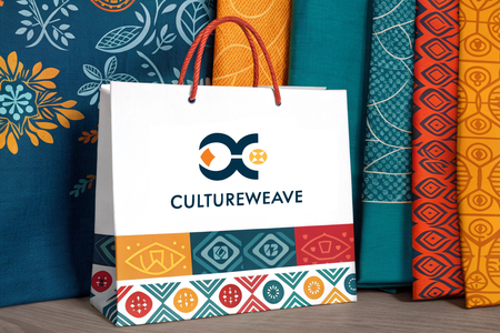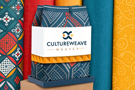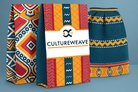 Recraft.ai. Prompt: Create a branded package for the brand of fashionable skirts «cultureweave», inspired by the folk flavor of different countries, against the background of natural fabrics using bright natural colors such as mustard, sea green and brick