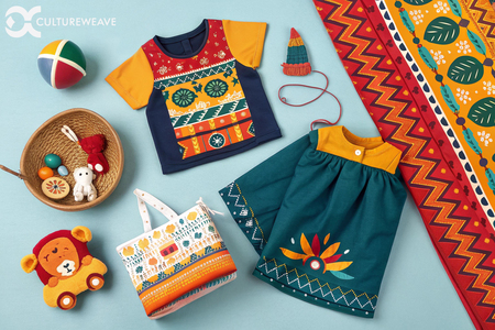 Recraft.ai. Prompt: Create a fashionable children’s product for the culture weave brand of fashionable men’s skirts, inspired by the folk flavor of different countries, using bright natural colors such as mustard, sea green and brick