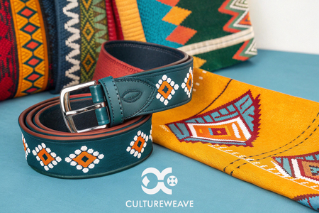 Recraft.ai. Prompt: Create a fashionable accessory for the brand of fashionable men’s skirts «cultureweave», inspired by the folk flavor of different countries, on the background of natural fabrics, usingbright natural colors such as mustard, sea green and brick