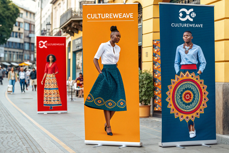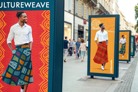Recraft.ai. Prompt: Create promotional materials (posters) for the brand of fashionable men’s skirts «cultureweave», inspired by the folk flavor of different countries, against the backdrop of a busy street, against a background of natural fabrics using bright natural colors such as mustard, sea green and brick