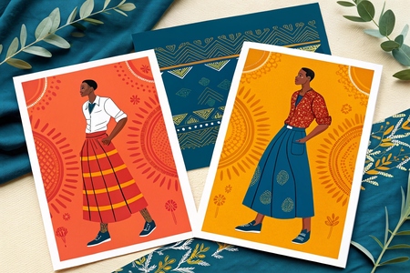 1. Recraft.ai. Prompt: Create postcards for the brand of fashionable men’s skirts «cultureweave», inspired by the folk color of different countries, on the background of natural fabric, using bright natural colors such as mustard, sea green and brick