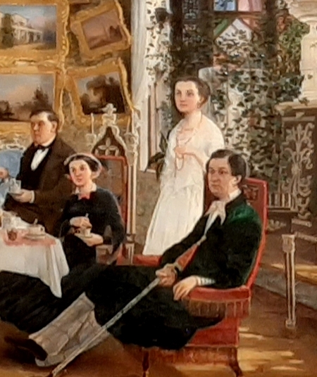 На представленном полотне хочется заострить внимание на девушке в белом. Светлый силуэт сразу приковывает внимание. Художник акцентирует внимание на героине, которая является немой тенью своего мужчины, который сидит рядом с ней.