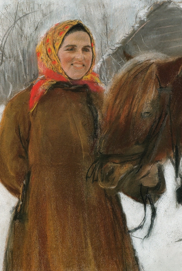 Говоря о женщине крестьянского происхождения, на данной картине мы обращаем внимание на героиню справа в красной юбке и небом платке. Совсем недалеко от нее мы видим мужчину, который бьет одного из крестьян, что явно дает нам понять, что отмена крепостного права все равно не смогла даровать рабочему классу полную свободу и независимость. На лице героини читается покорность и трепетание верующего человека.