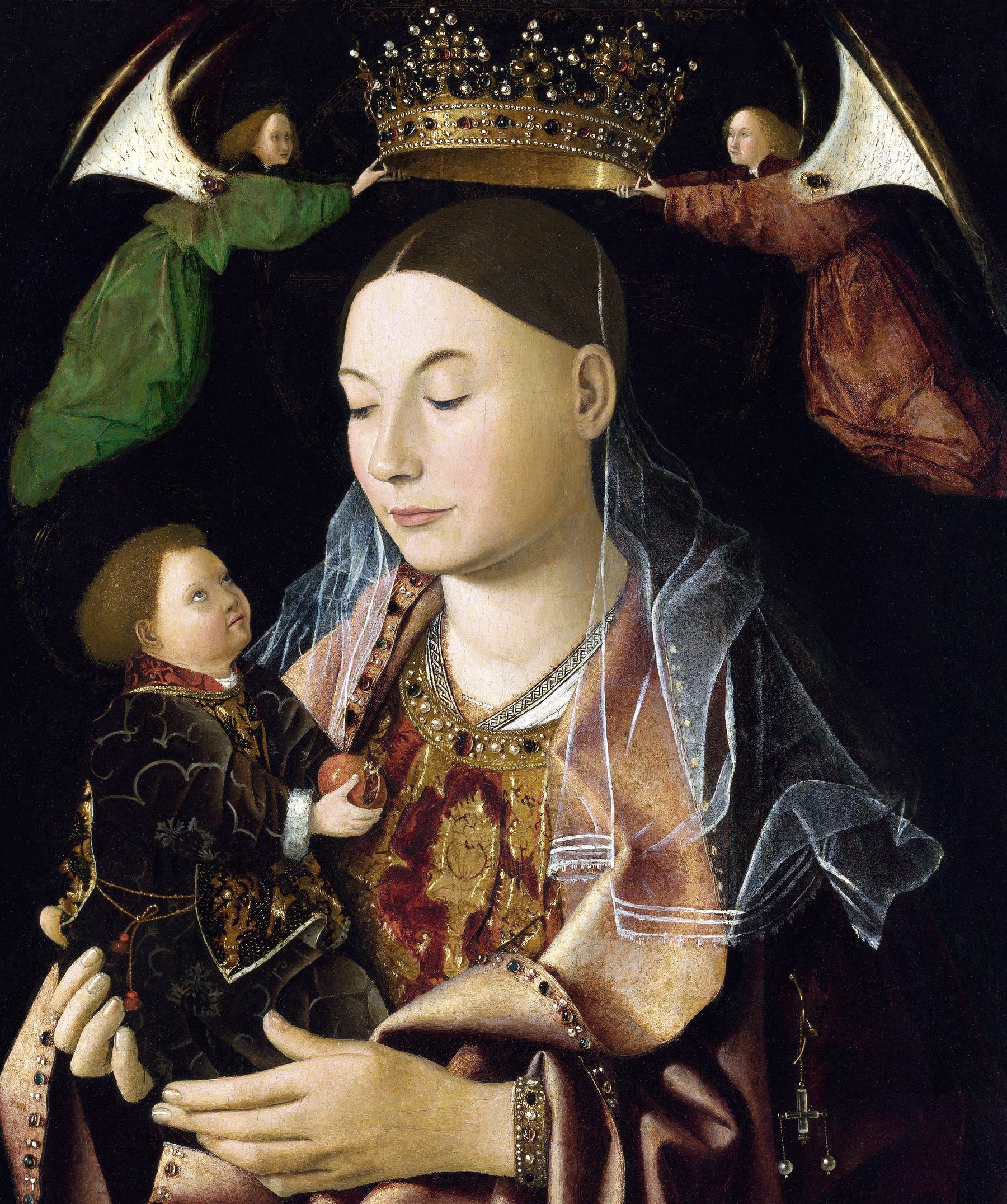 Картина «Мадонна с младенцем» (также известная как «Мадонна Салтинг» — по имени коллекционера Салтинга, владевшего ею в XIX веке) была создана в 1460-е. Её авторство традиционно приписывают Антонелло да Мессина — одному из важнейших мастеров итальянского Раннего Возрождения. На полотне изображены Дева Мария с младенцем Иисусом. Над Её головой два симметрично расположенных по обе стороны ангела в зелёных и красных одеждах возлагают на нее золотую корону, украшенную жемчугом и самоцветами. Этот элемент отсылает к иконографии «Коронования Девы Марии» — популярному сюжету в искусстве Ренессанса, подчёркивающему её статус Царицы Небесной.