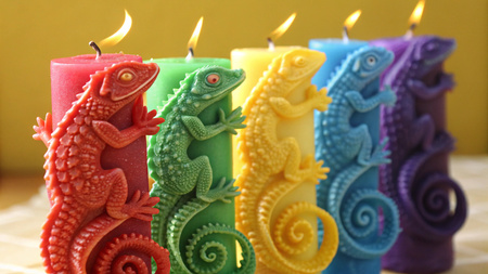 ChatGPT: Напиши промпт на Английском для фотографии ярких цветных свеч в форме ящериц.