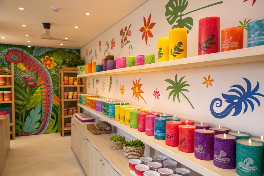 Промпт, сгенерированный Recraft: «Create an inviting interior view of a bright and colorful store that specializes in lizard-shaped candles. The store features shelves lined with vibrant, intricately designed candles in the shape of lizards, each one in bold, eye-catching colors like red, blue, green, yellow, and purple. The store itself is painted in lively hues, with splashes of bright oranges, greens, and pinks, giving it a fun and energetic atmosphere. Tropical plants and colorful flowers in decorative pots are placed around the store, adding a natural, exotic touch to the space. The lighting is warm and soft, highlighting the unique candles while creating a welcoming, cheerful environment.»