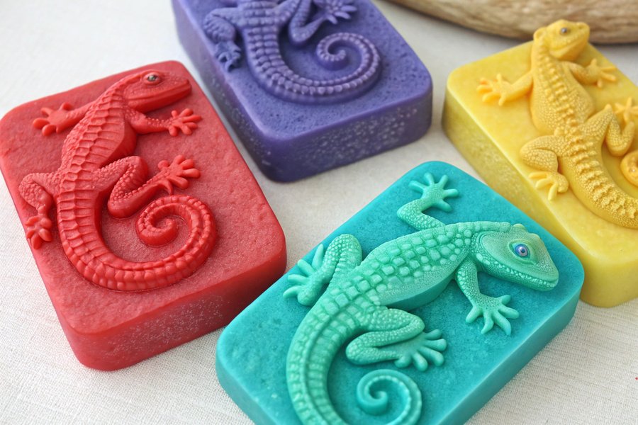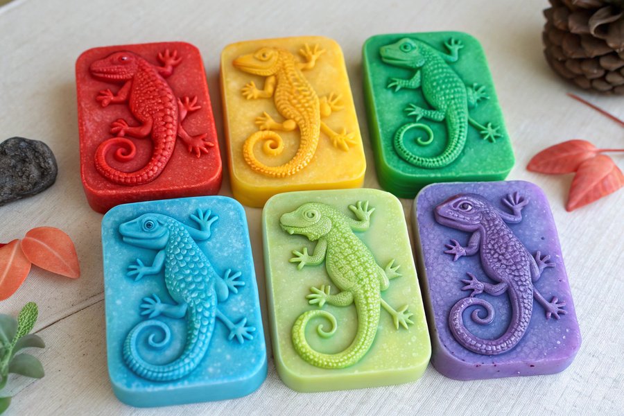 «Create a set of soap bars shaped like vibrant, detailed lizards. Each soap is intricately designed, with textured scales, curled tails, and lifelike features. The soaps come in bright, bold colors like red, blue, green, yellow, and purple, with each lizard having its own unique color combination. The soap has a smooth, glossy finish, and the colors are rich and vivid, making the lizards appear playful and eye-catching. The background should be simple and neutral, allowing the colorful soaps to stand out as the focal point.»