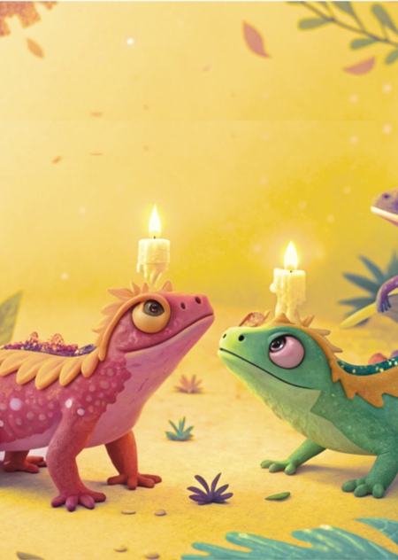 «An imaginative and colorful illustration featuring vibrant lizards with candle-like textures. The lizards have waxy, smooth bodies in various bright colors, and their tails resemble dripping candle wax. Each lizard has small, glowing flames on their backs or heads, mimicking lit candle wicks. The background is a dreamy, pastel-toned jungle filled with surreal plants and glowing accents, enhancing the magical atmosphere. The scene is whimsical and filled with intricate details, blending natural and fantastical elements.»