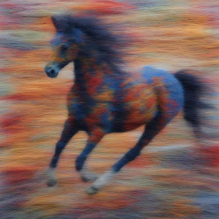 promt: «A galloping horse made of colored wool, in MariaSzakats style.» «A high mountain cliff made of swirling colorful wool, standing against the sky in MariaSzakats style.»