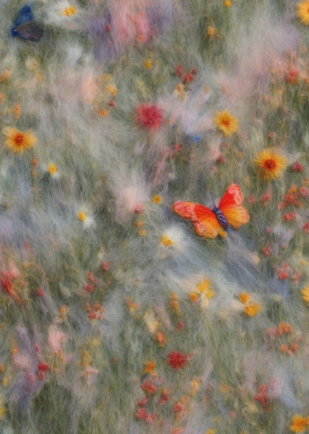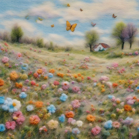 promt: «A dreamy textile meadow with dozens of flowers and floating butterflies, long strands of colored wool creating motion and texture, in MariaSzakats style.»