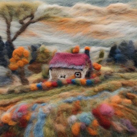 promt: «A cozy cottage in the countryside made of colorful wool, surrounded by textured fields and trees swaying in the wind, soft fibers blending into the landscape, in MariaSzakats style.»