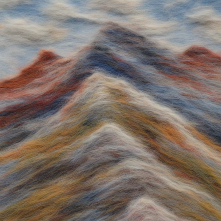 promt: «Snowy mountain landscape made of soft wool, with textured white peaks and swirling threads of fog, blurred gently by wind, in MariaSzakats style.»