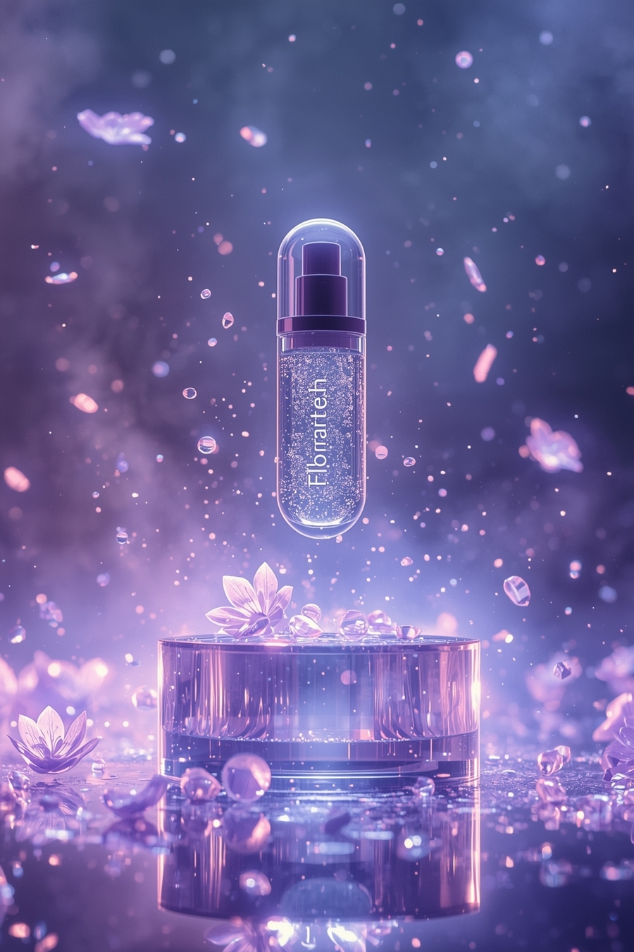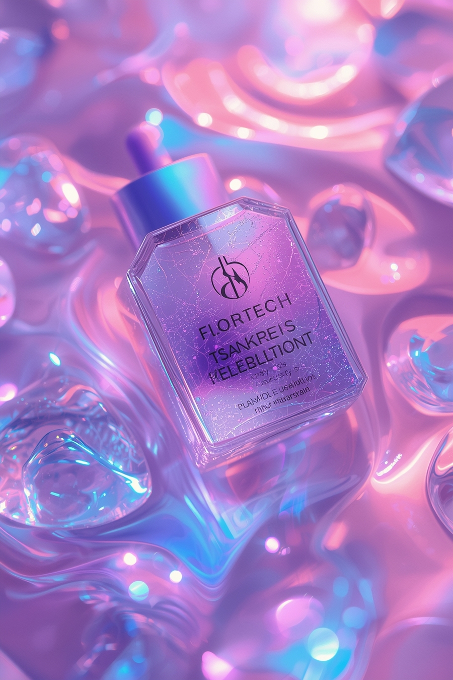 Prompt: Ultra-detailed advertising poster for the futuristic AI beauty brand Floratech, inspired by biotechnological aesthetics. Add fine glass textures, soft neon reflections, glowing gradients in pink, blue, and violet. Enhance cinematic lighting, depth of field, and metallic accents. Preserve original composition and typography. Style — Apple design + Refik Anadol surreal fluidity, elegant and immersive atmosphere.
