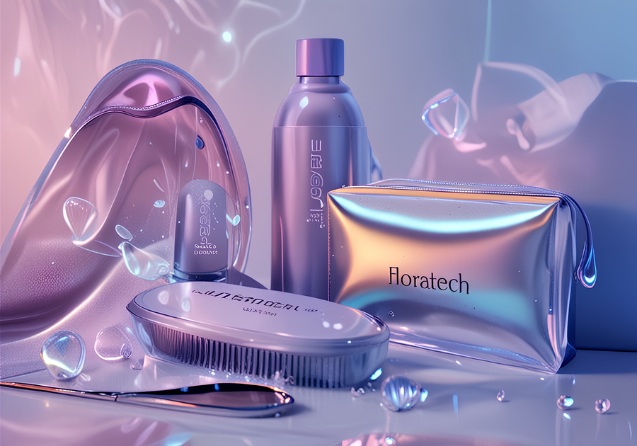 Prompt: A collection of futuristic hair care accessories and packaging for the brand «Floratech» — including a sleek brush, towel, and holographic cosmetic pouch. The materials combine transparent glass-like surfaces, soft silicone, and pearlescent metallic finishes. Ambient lighting in the brand palette — pink, violet, and sapphire blue — creates a smooth, luminous glow. The scene reflects Floratech’s identity: a fusion of advanced technology and natural softness. The composition is clean, minimal, and elegant, shot in cinematic product-photography style with volumetric lighting, realistic textures, and gentle reflections. The background is a smooth gradient environment inspired by futuristic nature aesthetics — ethereal, luxurious, and ultra-detailed.