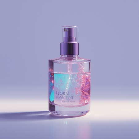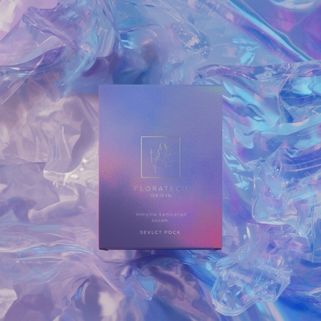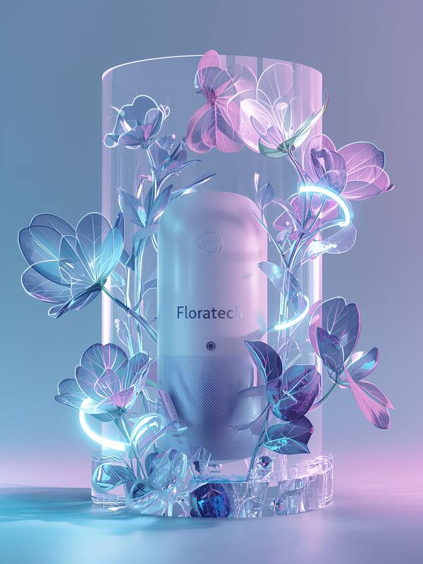 Prompt: Refine the product packaging of Floratech by integrating the brand identity — subtle logo placement, soft neon reflections in blue, pink, and violet tones, and a delicate holographic sheen. Preserve the elegant minimal form, enhance lighting contrast and realism. Add hints of AI-inspired textures, like smooth flowing data lines within the material.
