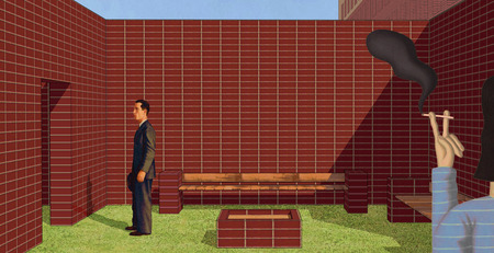 «К. шел вперед, не сводя глаз с Замка, ничто другое его не интересовало. Но чем ближе он подходил, тем больше разочаровывал его Замок, уже казавшийся просто жалким городком, чьи домишки отличались от изб только тем, что были построены из камня, да и то штукатурка на них давно отлепилась, а каменная кладка явно крошилась. <…>. „Между Замком и крестьянами особой разницы нет“, — сказал учитель.»