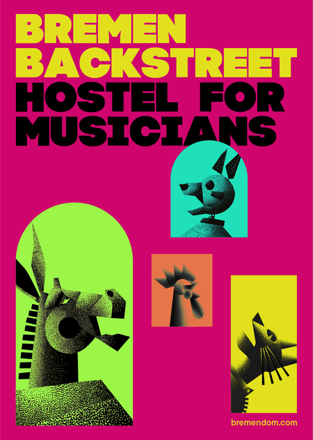 BREMEN BACKSTREET is not just a hostel. It’s a safe haven for wandering musicians, tired travelers, and those whose soul doesn’t sound in a uniform way. It’s a sleepover where you don’t appreciate perfect hearing, but a desire for freedom and music. You can leave the guitars in the corner, find a jam gang, and live outside the rules. It’s based on the visual concept of a four-thinking animal musicians re-thinking in the form of bold geometric silhouettes. Ossel, Dog, Cat and Petuch become guest guides around the hostel area, meeting them on signs, posters, and the best. Their dynamic positions and open mouths create a sense of eternal jam.