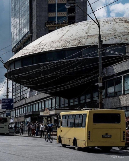 ВНИИОФИ, Москва, 1982 г. /«Летающая тарелка», часть здания Института научно-технической информации (УкрИНТЭИ), Киев, архитекторы Ф. И. Юрьев и Л. В. Новиков, 1971 г.
