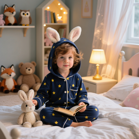 Промпт #1: A 6-year-old child wearing dark blue pajamas with a hood that has bunny ears and with the yellow stars pattern, sitting on a cozy bed in a softly lit children’s bedroom. Warm golden lamplight, plush toys in background. Medium shot, 50 mm lens, shallow depth of field, gentle bokeh background. Professional product photography for a children’s sleepwear brand, high-resolution, soft warm tones, dreamy cozy atmosphere.