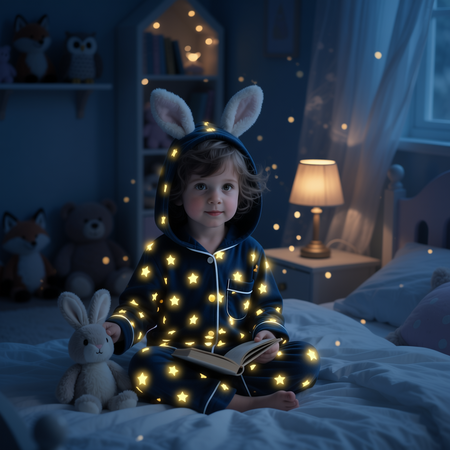 Промпт #2: A 6-year-old child wearing the same pajamas with bunny-ear hood as before, now in a dark cozy bedroom illuminated only by the soft glow of stars on the pajamas. The stars gently emit light, creating a magical nighttime atmosphere. Warm bluish lighting, soft shadows, subtle bokeh, dreamy and peaceful mood. Professional photography, shallow depth of field, high-resolution product promo image for glow-in-the-dark sleepwear.