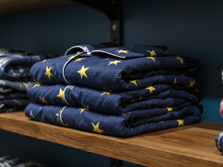 Промпт #2: Close-up photo of neatly folded dark blue children’s pajamas with a soft fabric texture and a yellow star pattern. The pajamas are stacked on warm wooden shelves inside a cozy boutique with dark blue walls and dim ambient lighting. Shallow depth of field, professional product photography, cinematic lighting, high-resolution, realistic detail.