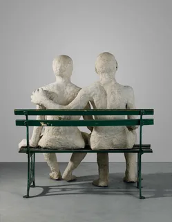 Скульптуры Джорджа Сегала, выполненные в виде белых или серых гипсовых слепков, изображают людей в обыденных, но застывших позах. В композиции «Любовники» руки соединены в объятии, но нейтральный цвет и грубый материал лишают их тепла, подчеркивая уязвимость и одиночество даже в моменты близости. Это абстракция контакта: жест есть, но жизнь из него ушла. Тем не менее, это сознательный выбор близости — руки делают попытку преодолеть отчуждение, оставаясь при этом фрагментами. Это позитивный, но не наивный финал, показывающий, что близость требует усилий и остается хрупкой, даже когда достигнута.