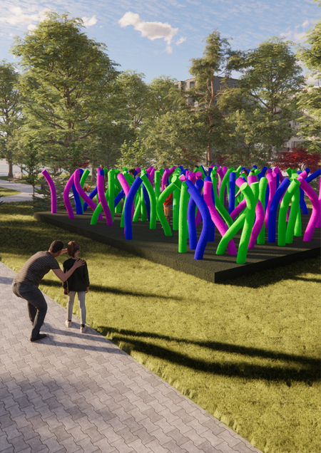 Арт-объект «Вечеринка» представляет собой площадку 10×10 м, возвышающуюся над землёй на 150 мм. В площадку врезаны цилиндрические поролоновые трубы высотой 1650 мм и диаметром 150 мм. Расстояние между трубами составляет 600 мм, что не препятствует движению человека между ними, однако в тоже время создает эффект камерности и скрытности, имитируя лабиринт. Поролоновые трубы выкрашены в яркие цвета, соответствующие тематике фестиваля «Пикник Афиши»