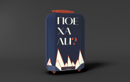 8. -blue metal space suitcase with a small red rocket on the side and small red inscription «KOMCOMOLKA» on small wheels with a dark blue background
