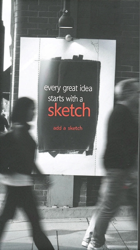 Create a realistic mockup for a city poster featuring the slogan «Every Great Idea Starts with a Sketch» for «add a sketch», a creative studio dedicated to artistic exploration and self-expression. The mockup should showcase the poster in a dynamic urban setting, making it feel like it belongs in a real-world environment while retaining the vibrant and creative aesthetic of the brand.