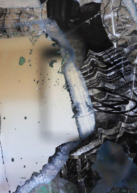 Техника: коллаж из фото и монотипий, отпечатанных на скотче, расположенный на зеркале с фрагментарно снятым зеркальным слоем.