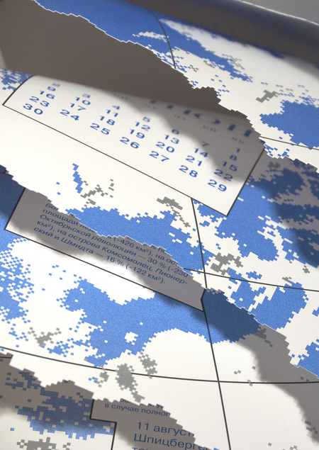 The design of the calendar is a metaphorically representative of the gradual melting process. Each month is a certain region that is prone to the retreat of glaciers due to global warming.
