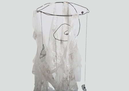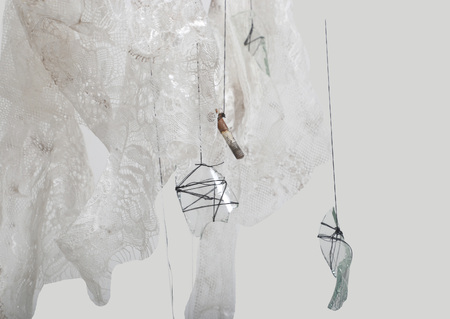 материалы: кружевная ткань, черная проволока, осколки стекла, ржавый гвоздь, черная нить