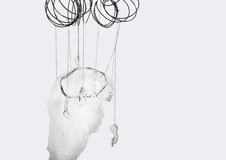 материалы: кружевная ткань, черная проволока, расплавленный пластик, черная нить