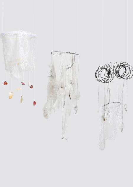 Я создала три детских мобиля, которые являются метафорой забвения в контексте возвращения к изначальному состоянию, то есть в раннее детство, к каждому из них я подвесила предметы, ассоциативно связанные с одним из видов забвения. Текстиль, а именно кружевная ткань, становится связующим и основной ассоциацией забвения для всех объектов в серии.