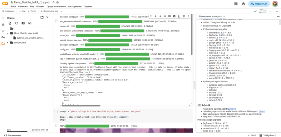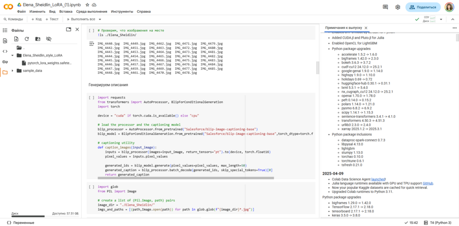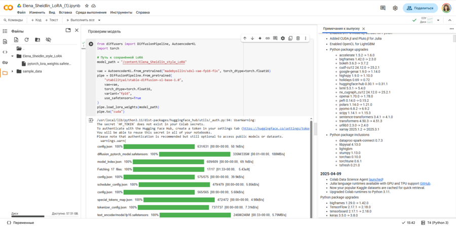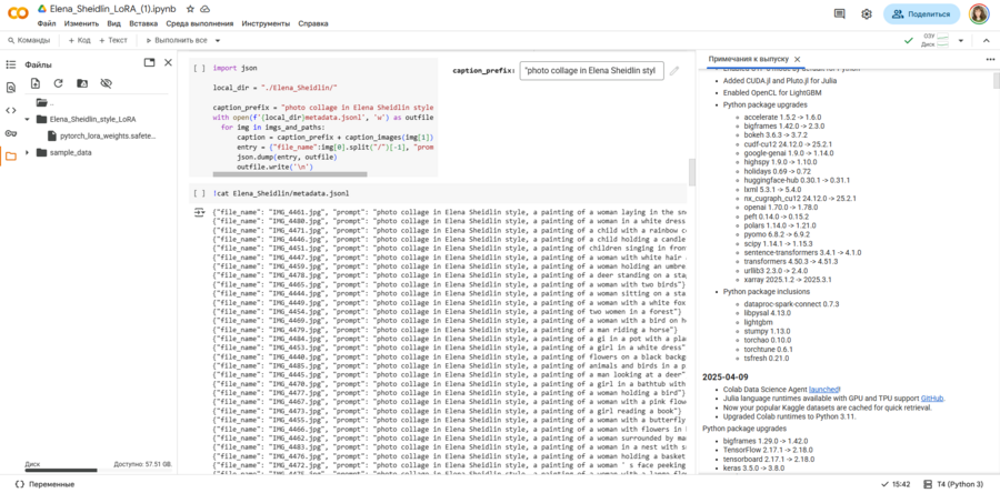 Для обучения Stable Diffusion я сделала датасет из 39 работ 18 работ Елены Шейдлиной, которые взяла из её творческого инстаграмма (запрещённого в РФ). После, я адаптировала готовый код из лекции под свой проект.