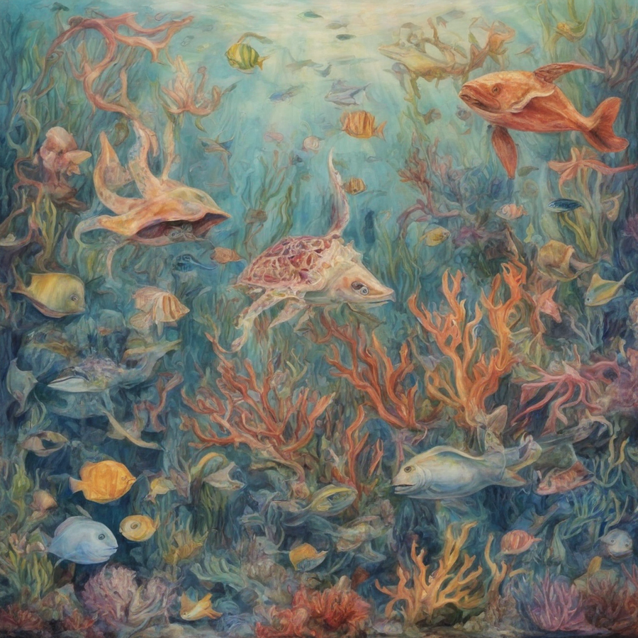 prompt = «A fantastical underwater world filled with colorful marine life and whimsical plants, depicted in the vivid and intricate manner characteristic of Ellen Sheidlin.»