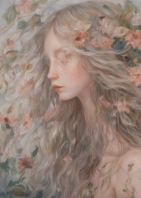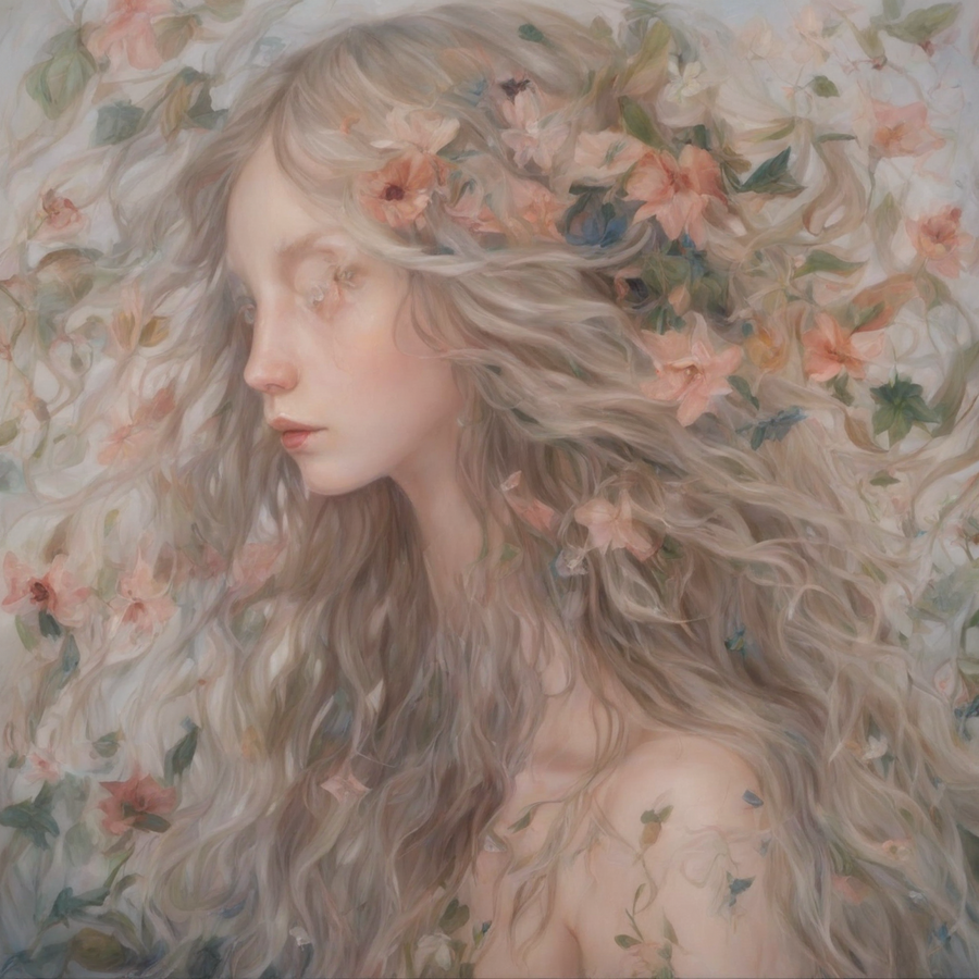 prompt = «An ethereal portrait of a young woman surrounded by nature, with flowing hair and floral patterns, reflecting the delicate and imaginative style of Ellen Sheidlin.»