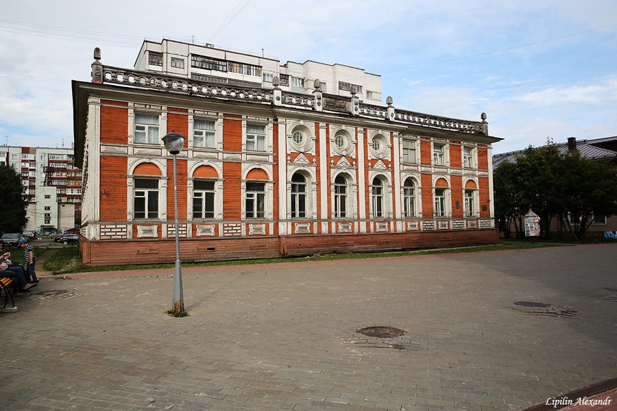 Примеры деревянного зодчества Архангельской области. На первом изображении Дом Сутягина или Деревянный небоскрёб, Соломбальский небоскрёб (1992-2008), на втором Церковь Георгия Победоносца из д. Верши