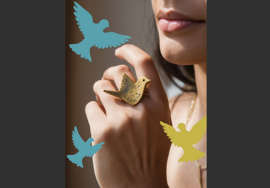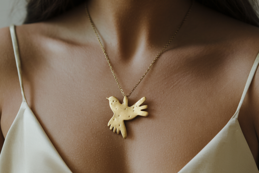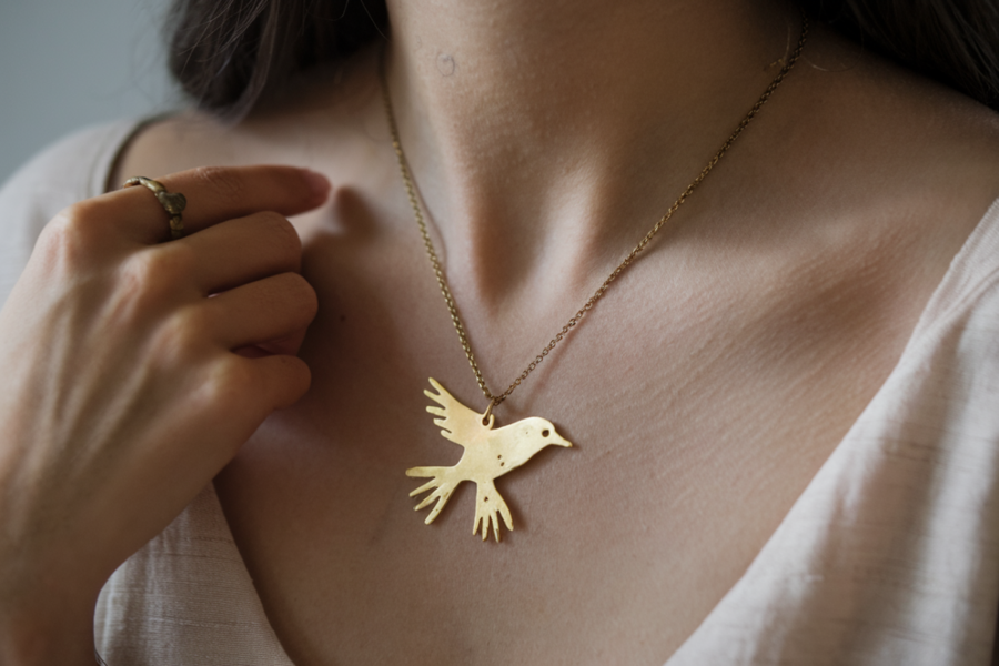 A golden bird-shaped pendant, made of brass, suspended by a delicate chain. The pendant with its simple and rustic charm is placed on a woman neck. The bird pendant has minor imperfections, because it is handcrafted and designed to have a rustic charm. The jewelry style is naive and primitive, no details, the form is highly minimalistic. Inspired by Mark Shagal naive and primitive nature of the jewelry.