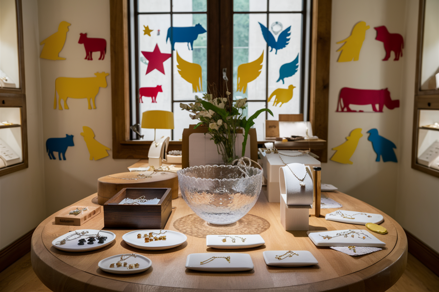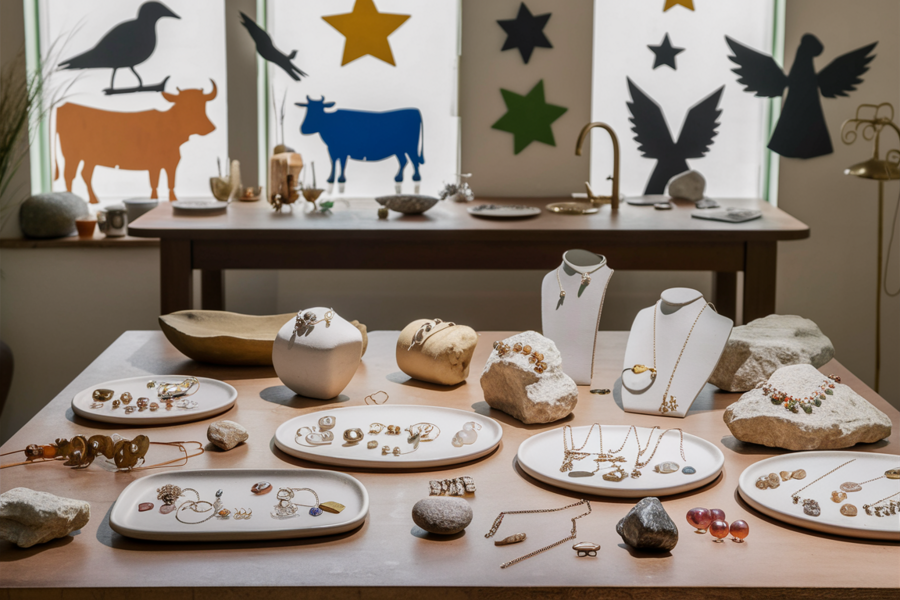 A tabletop display of various jewelry in a shop for sale. There are white plates with small jewelry items placed on them, a wooden box, and a clear bowl with a unique shape. The table is set against a backdrop of a room with a wooden table and a window. The overall ambiance suggests a calm and organized setting in a boutique or an artisanal shop. There are flat sillouettes of yellow, red and blue images of birds, cows, stars and angels in the interior