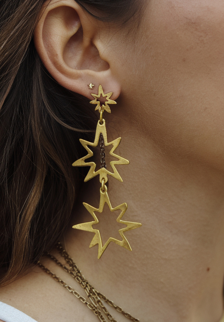 A golden angel-shaped hairpin with, made of brass placed on woman hair. The angel figure is minimalistic and has little detail. Picture from woman face. The angel hairpin has minor imperfections, because it is handcrafted and designed to have a rustic charm. The jewelry minimalistic form and simplicity of the design style create a harmonious balance. Inspired by Mark Shagal naive and primitive art. The natural light illuminates the scene, highlighting the warm golden hues.