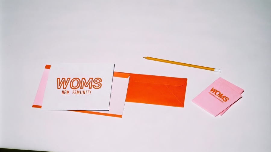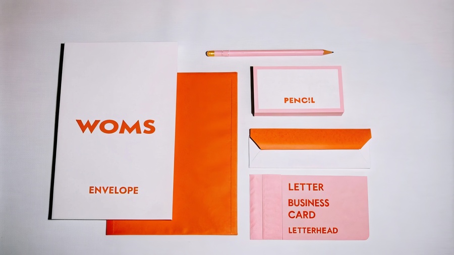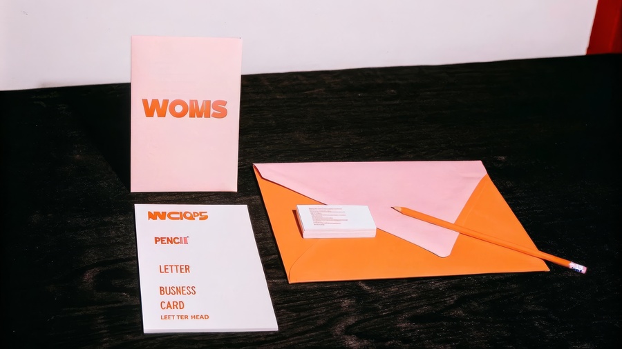 /imagine prompt: create a layout of branded printed products (envelope, pencil, letter, business card, letterhead) for a women’s clothing brand with the name «woms» (we are talking about new femininity) in bright orange and soft pink, bold grotesque font for headings, thin grotesque for typesetting, bold grotesque logo reiseburo font
