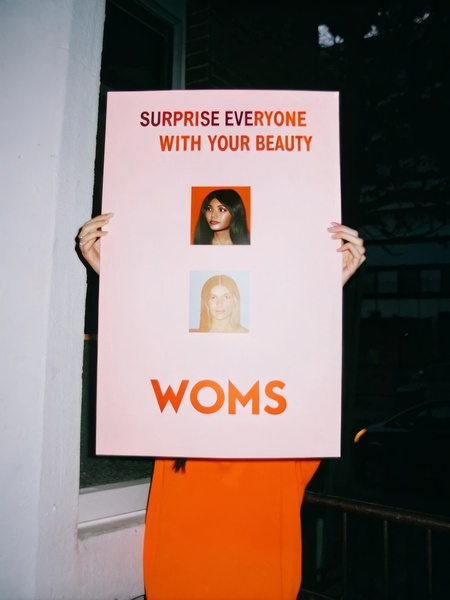 /imagine prompt: create an a4 size poster for a women’s clothing brand called «woms» (we are talking about new femininity) the text for the poster is «surprise everyone with your beauty» the font is thick grotesque reiseburo font the style of the poster is a collage of different photos of women, the logo is thick grotesque, the colors are bright orange and soft pink