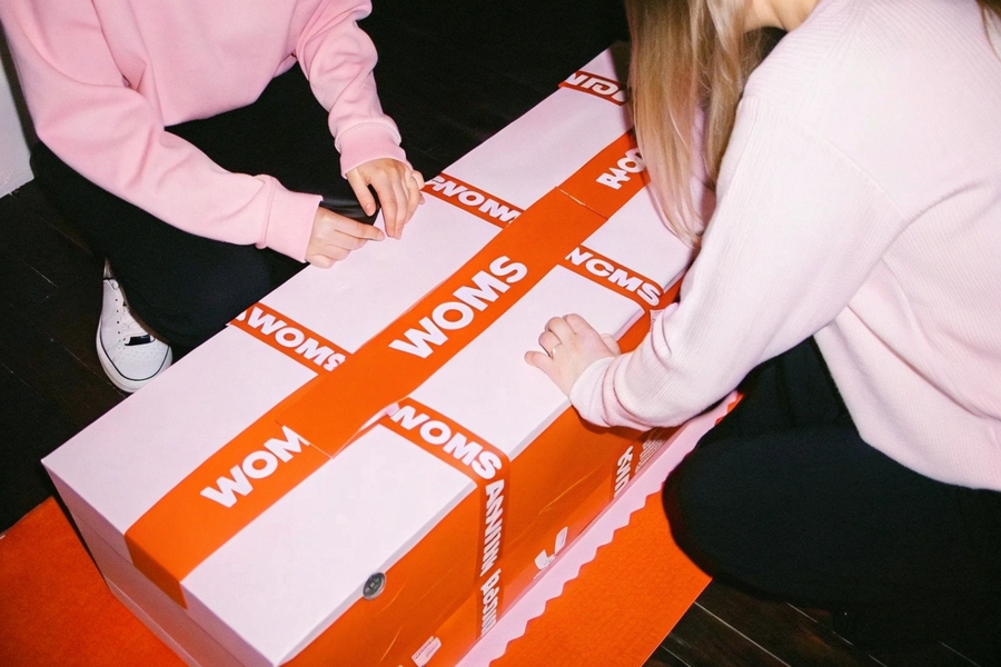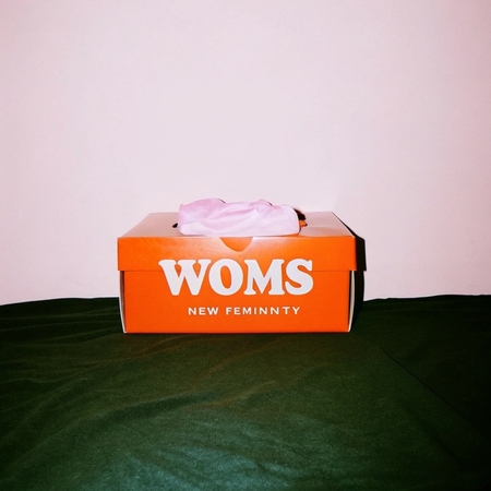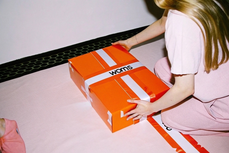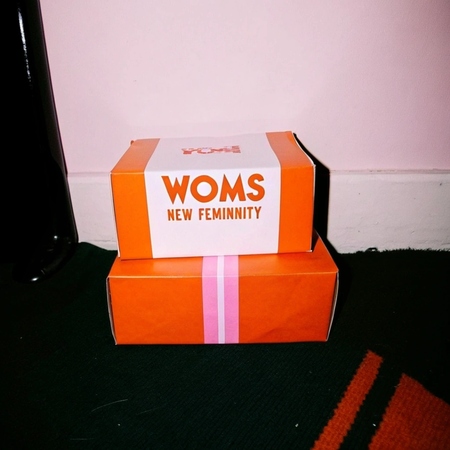 /imagine prompt: create a branded box for transporting goods for a women’s clothing brand called «woms» (we are talking about new femininity) on the box the brand name is written in grotesque, the logo is bold grotesque, the colors are bright orange and soft pink