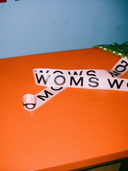 /imagine prompt: make branded tape for a women’s clothing brand called WOMS on which the brand name will be written as a pattern all over the tape scene tape is lying on the table