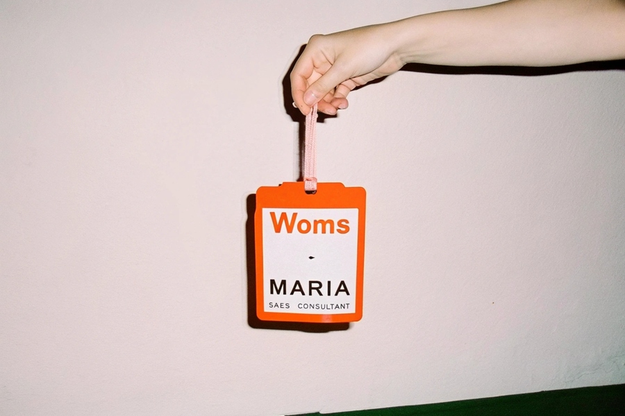 /imagine prompt: badge for the store staff for the women’s clothing brand called woms the badge has the girl’s name Maria written on it and her photo her position is also written the badge itself is square on a string the sales consultant font is grotesque