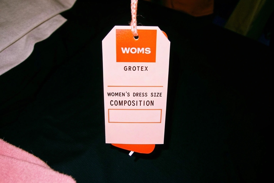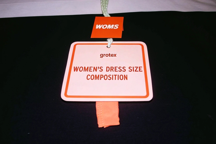 /imagine prompt: label for dress for clothing store about new femininity size rectangular on string written about women’s dress size composition font grotex brand name woms